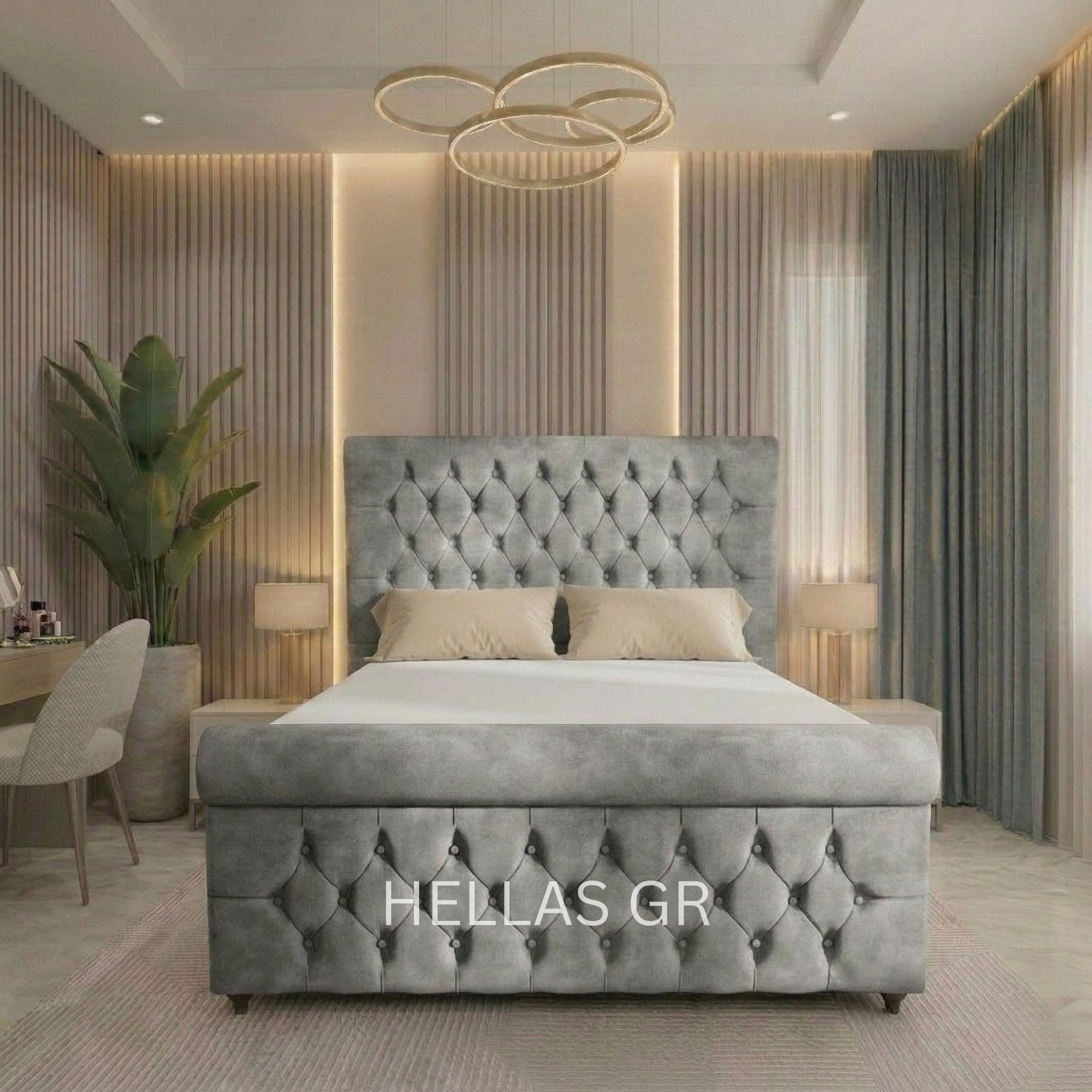 The Imperial Button Ottoman Bed exudes a beautifully composed and architectural presence, with the generously proportioned headboard dominating the space through a series of vertically channelled panels. These are defined sharply, giving a rhythmic effect of light and dark that gives the bed a sculptural appearance, with the soft upholstered finish providing a subtle contrast to the geometrically precise design, balancing beauty with comfort.